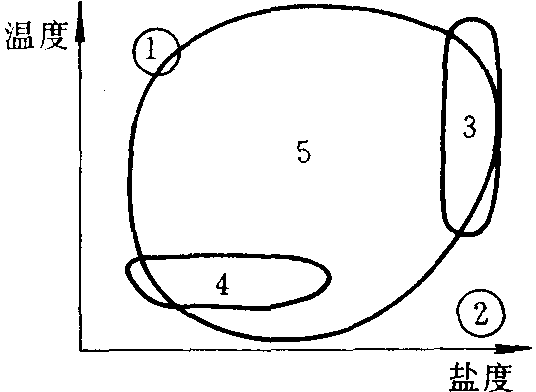 下图绘出了5种鱼的耐盐范围和耐温范围。在这5种鱼中哪一种是北极海的特有种,哪一种只生活在热带湖泊中,哪一种的分布最广泛? 。