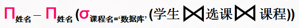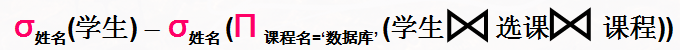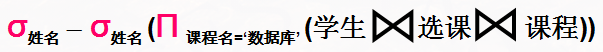 已知关系:学生(学号,姓名,性别,年龄), 课程(课程号,课程名,学分),选课(课程号,学号,成绩)。表示“查询没有选修数据库课程的学生姓名”的关系代数操作是________。