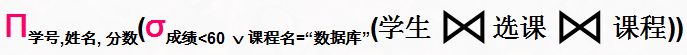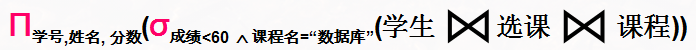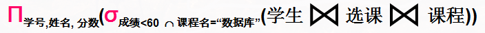 现有关系数据库如下: 学生(学号,姓名,性别,专业),课程(课程号,课程名,学分),选课(学号,课程号,分数)。检索“‘数据库’课程不及格学生的学号、姓名和分数”。其正确的关系代数表达式是________。