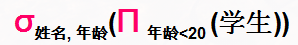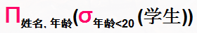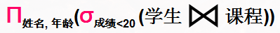 已知关系:学生(学号,姓名,性别,年龄), 课程(课程号,课程名,学分),选课(课程号,学号,成绩)。表达“查询年龄未满20岁的学生姓名及年龄”的关系代数表达式是_______
