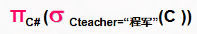 已知关系课程表C,用关系代数查询“程军”老师所授课程的课程号(C#)和课程名(Cname),正确的是__________。课程表CC#CnameCteacherK1C语言王华K5数据库原理程军K8编译原理程军