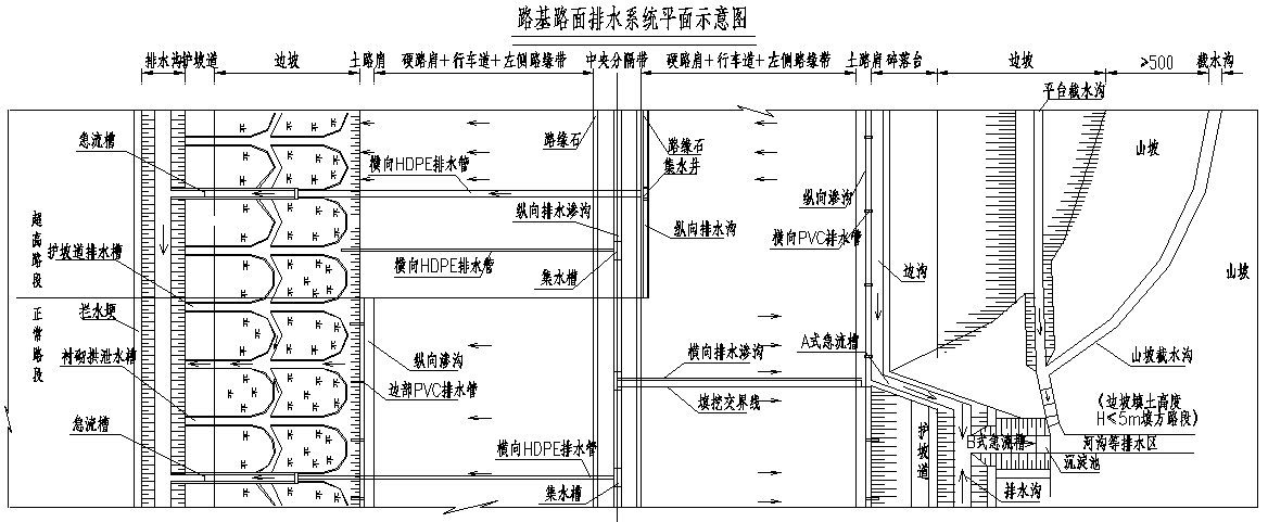 3.路面表面排水:①挖方路段由路拱自然漫流排出土路肩外,经边沟排出;②填方路段, 边坡高度H≤5m,路面水由路拱自然漫流排出土路肩外,沿边坡坡面 汇入排水沟排出;边坡高度H>5m,路面水由路拱自然漫流排出土路肩外,沿衬砌拱泄水槽、经护坡道排水槽进入排水沟;③超高路段外侧路面水,流进设在左侧路缘带内的纵向排水沟、集水井,通过横向排水管,经急流槽流入排水沟。