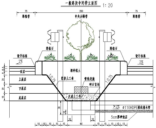 5.中央分隔带排水:由纵向碎石盲沟、集水槽及横向排水管组成。