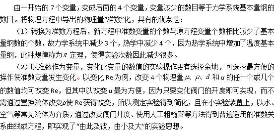 转换为准数方程后,新方程中准数变量的个数与原方程变量个数相比减少了基本量纲数的个数,故力学系统中减少3个,热学中减少4个,因为热学系统中增加了温度基本量纲,此种规律称为