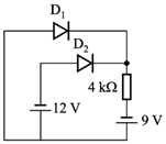 下图所示电路中,D1、D2均为理想二极管,则它们的通断状态分别为: 。