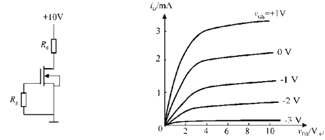 下图为场效应管电路和它的输出特性曲线,若Rg=1MΩ,Rd=5 kΩ,则从图中可知场效应管工作在( )。