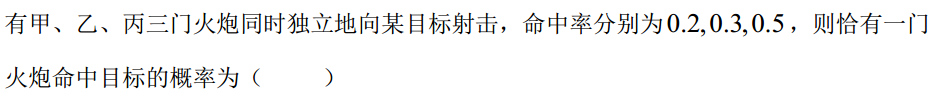 有甲、乙、丙三门火炮同时独立地向某目标射击,命中率分别为0.2,0.3,0.5,则恰有一门火炮命中目标的概率为