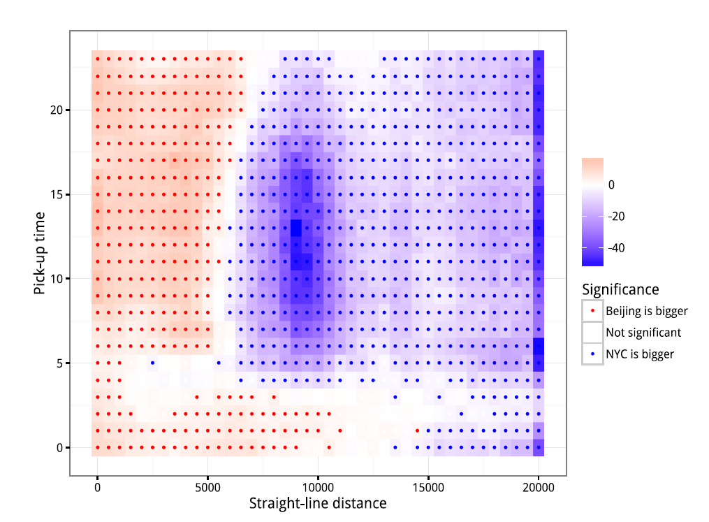 本章“故事背后的统计”所讲述的《城市道路利用率的双城记》,给出了按照时间和出行距离交叉分组的假设检验结果图,分析该图发现,针对5-15千米的中、长途出行方式,纽约的绕路比显著高于北京,该特征在白天尤为明显。