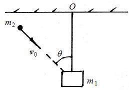 如图所示,一轻绳悬挂质量为m1的砂袋静止下垂,质量为m2的子弹以速度v0倾斜角q 射入砂袋中不再出来。则子弹与砂袋一同开始运动时的速度为( )。