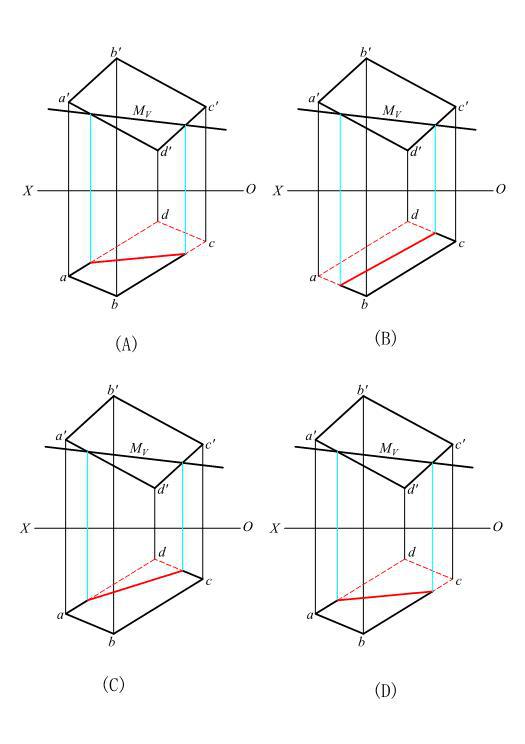 作正垂面M与平面ABCD的交线,并表明可见性。下面各图中作图正确的是: