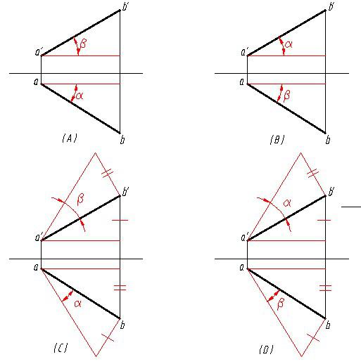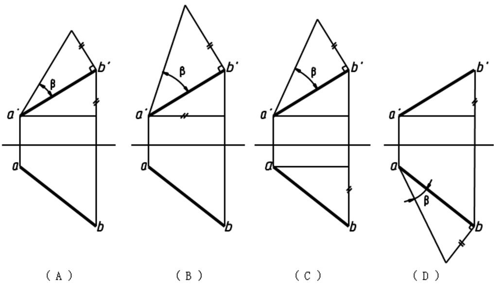 直角三角形法求一般位置直线AB对正投影面的倾角β,下图中正确的是:
