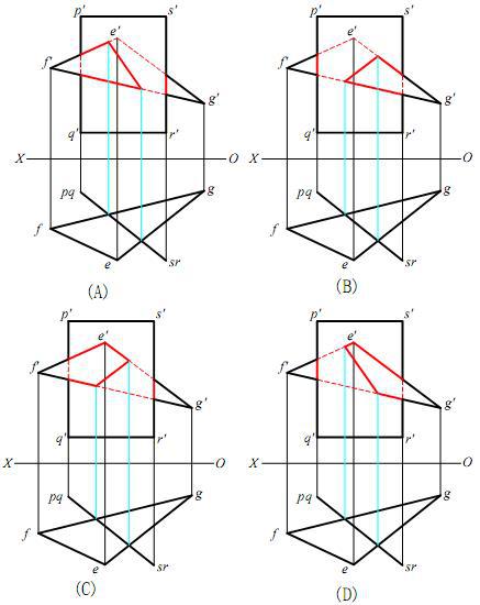 作∆EFG与平面PQRS的交线,并表明可见性。下面各图中作图正确的是: