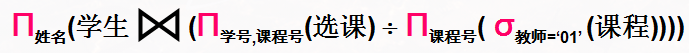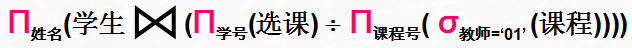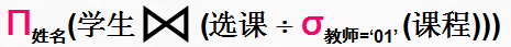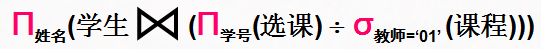 已知关系:学生(学号,姓名,性别,年龄),课程(课程号,课程名,教师,学分),选课(学号,课程号,成绩)。表达查询“选修了教师01所教全部课程的学生的姓名”的关系代数操作是_________。