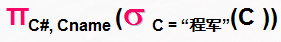 已知关系课程表C,用关系代数查询“程军”老师所授课程的课程号(C#)和课程名(Cname),正确的是__________。课程表CC#CnameCteacherK1C语言王华K5数据库原理程军K8编译原理程军