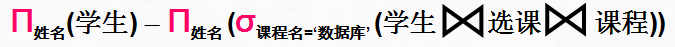 已知关系:学生(学号,姓名,性别,年龄), 课程(课程号,课程名,学分),选课(课程号,学号,成绩)。表示“查询没有选修数据库课程的学生姓名”的关系代数操作是________。
