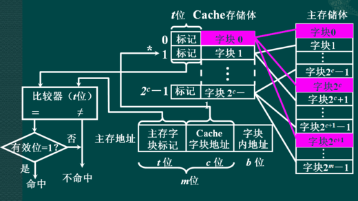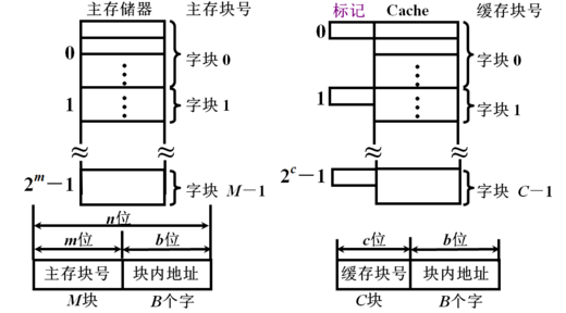 主存由2n个可编址的字组成,每个字有唯一的n位地址。为了与Cache映射,将主存与缓存都分成若干块,每个块内有包含若干个字,并使它们的块大小相同(即块内的字数相同)。这就将主存的地址分成两段:高m位表示主存的块地址,低b位表示块内地址,则2m = M表示主存的块数。同样,缓存的地址也分为两段:高C位表示缓存的块号,低b位表示块内地址,则2c = C表示缓存块数。主存与缓存地址中都用b位表示其块内字数,即B = 2b 反映了块的大小,成B为块长,主存的块数M,与缓存的块数C的关系为____