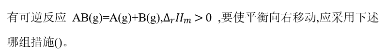 有一可视为理想气体混合物体系的放热反应: 2 A(g) + B(g) = C(g) + D(g), 下列条件中哪一种可使反应向正向移动( )