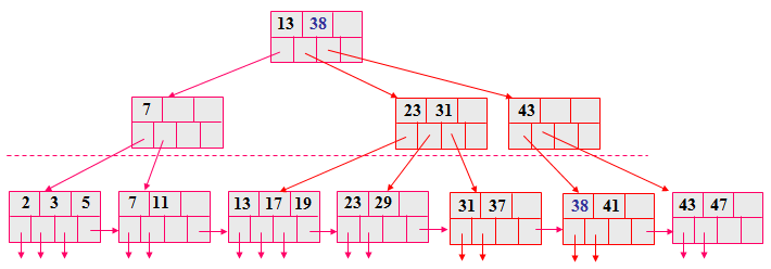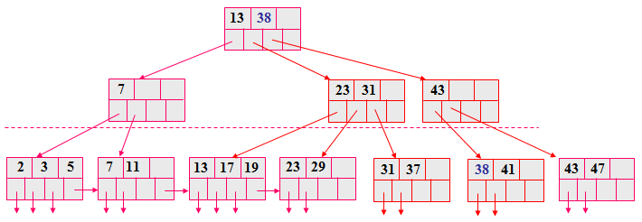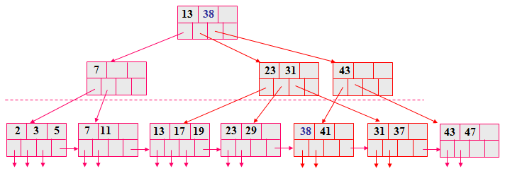 若要在此B+树上增加一个键值为38的索引项,插入完成后的B+树是___________。