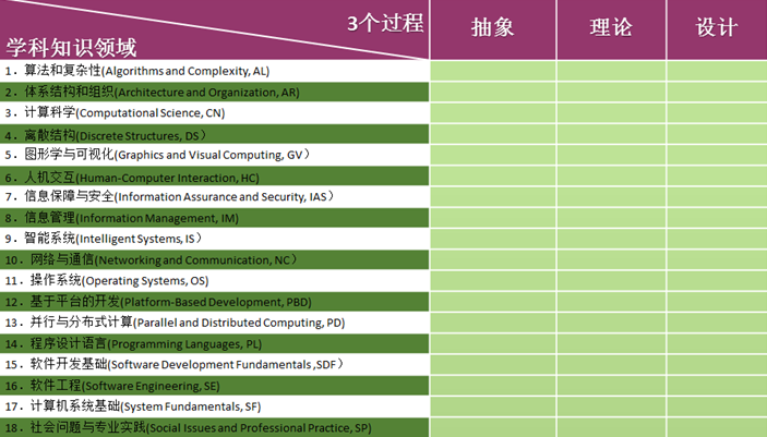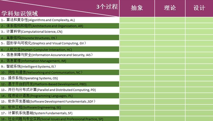 C: 计算学科二维定义矩阵横向一维由抽象、理论、设计等3个过程组成,根据CS2013报告,其纵向一维可划分为18个学科知识领域。