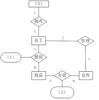 一个公司有一个销售部门,一个销售部门有若干员工,每位员工都可以销售若干商品,每个商品都可以由若干员工销售,一个商品可以存放在若干不同的仓库中,一个仓库可以存放不同的商品,一个员工可以管理若干仓库,该单位销售部的E-R图(提示:销售时有一个“销售明细”属性;存放时有一个“存放与出库时间”的属性)如下所示,图中空白填写顺序应为()