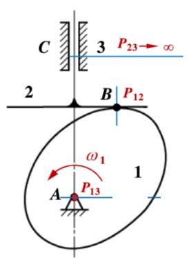 凸轮1和直动从动件2的瞬心P12应该与接触点B重合(如图所示)。