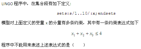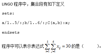 对于产大于销的不平衡模型,LINGO程序的集合段如下sets:s1/1..3/:a;!定义产地;s2/1..4/:b;!定义销地;ss(s1,s2):x,c;!定义运量和单价;endsets对产量约束的书写正确的是( )。
