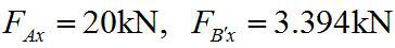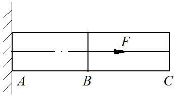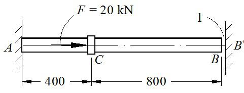 如图所示钢杆的直径为5mm,左端固定有墙A,右端B与墙B′ 有间隙δ=1mm,截面C上作用有外载荷F=20kN(忽略C处套环的影响),已知弹性模量Est=200GPa,求A及B′处的支反力分别是( )。