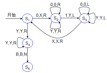 下图为用状态转换图示意的一个图灵机,其字母集合为{0,1,X,Y,B},其中B为空白字符;状态集合{S1,S2,S3,S4,S5},其中S1为起始状态,S5为终止状态;箭头表示状态转换,其上标注的如in, out, direction表示输入是in时,输出out,向direction方向移动一格,同时将状态按箭头方向实现转换,其中in,out均是字母集中的符号,direction可以为R(向右移动)、L(向左移动)、N(停留在原处)。