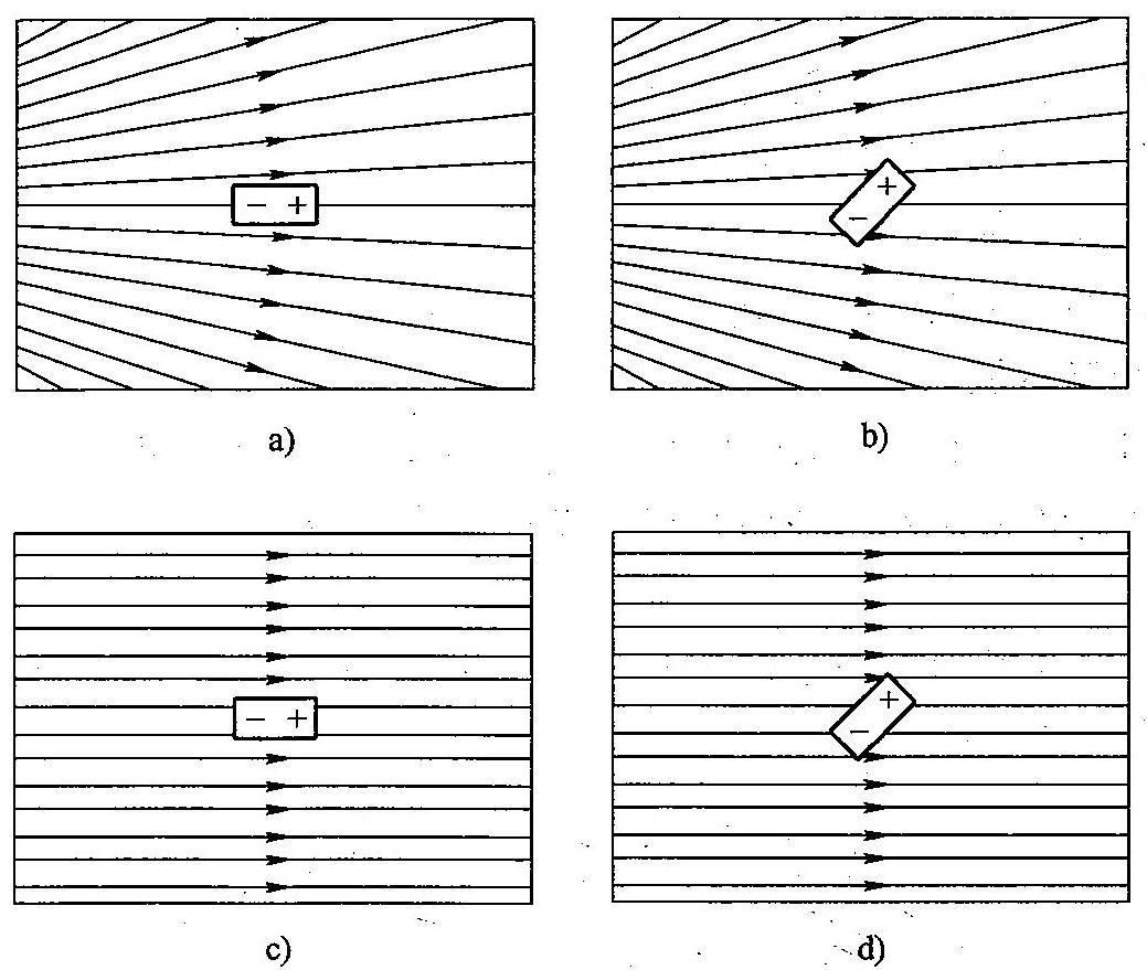 如图所示,一个正负电荷相等的电偶极子处于外加电场中,问以下哪一个图中的偶极子所受的合力为零?