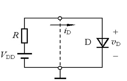 电路如图所示,电源VDD等于1V,电阻R等于10KΩ的时,若用恒压降模型(硅0.7V)来求解二极管两端所对应和电流。
