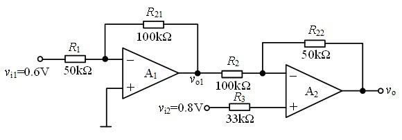 由集成运放A1、A2组成的反馈放大电路如图所示,设A1、A2均为理想运放。试求闭环电压放大倍数Avf =vo/vi。