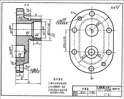 采用砂型铸造法生产图中右端盖铸件。在单件小批生产条件下该铸件最合理的造型方法为 (整模/分模/挖砂/活块/三箱/地坑/刮板)造型。