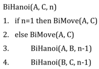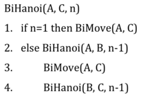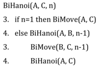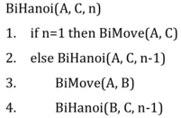 双Hanoi塔问题是Hanoi塔问题的一种推广,与Hanoi塔的不同点在于:2n个圆盘,分成大小不同的n对,每对圆盘完全相同。初始,这些圆盘按照从大到小的次序从下到上放在A柱上,最终要把它们全部移到C柱,移动的规则与Hanoi塔相同。BiHanoi(A, C, n)的功能是从A移动2n个盘子到C,其中BiMove(A, C)表示从A移动两个盘子到C。下列哪一段代码是利用分治策略给出的正确的移动策略: