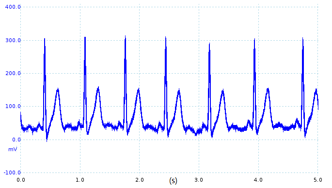 下面是一个实测的心电信号波形,可以近似看作一个周期信号,请问信号的频率是多少 ?