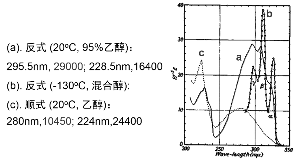 答案: 【 顺式结构比反式结构稳定,所以顺式最大吸收波长发生蓝移至280nm】