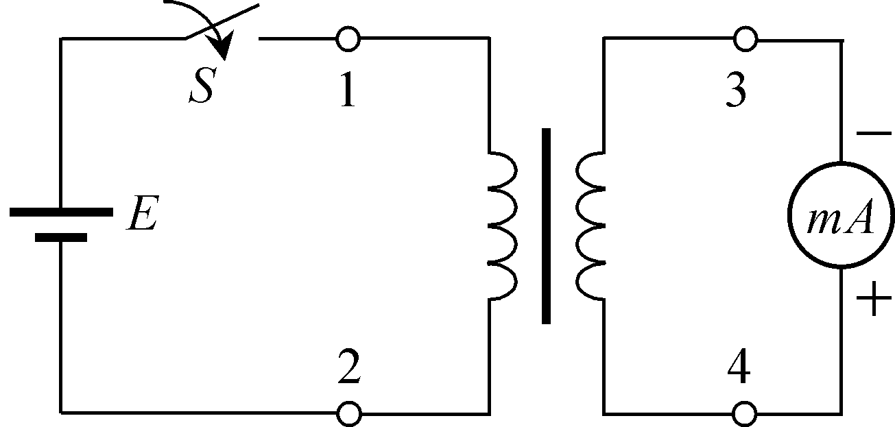 如图,利用直流法测量单相变压器的同名端。1、2为原绕组的抽头,3、4为副绕组的抽头。当开关闭合时,直流电流表正偏。这说明______。