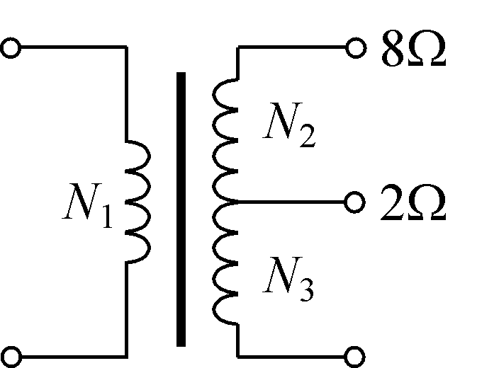 如图,某输出变压器的副绕组有中间抽头,以便接8 Ω或2 Ω的扬声器,两者均能达到阻抗匹配,则副绕组两部分匝数比N2/N3为______。