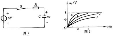 RC串联电路与电压为8V的恒压源在t = 0瞬间接通,如图1所示,接通前uC ( 0– ) = 0 ,电阻分别为1 kΩ,6kΩ,3kΩ和4 kW时得到4条uC ( t )曲线如图2 所示,则4 kW电阻所对应的uC ( t ) 曲线是 ( )。