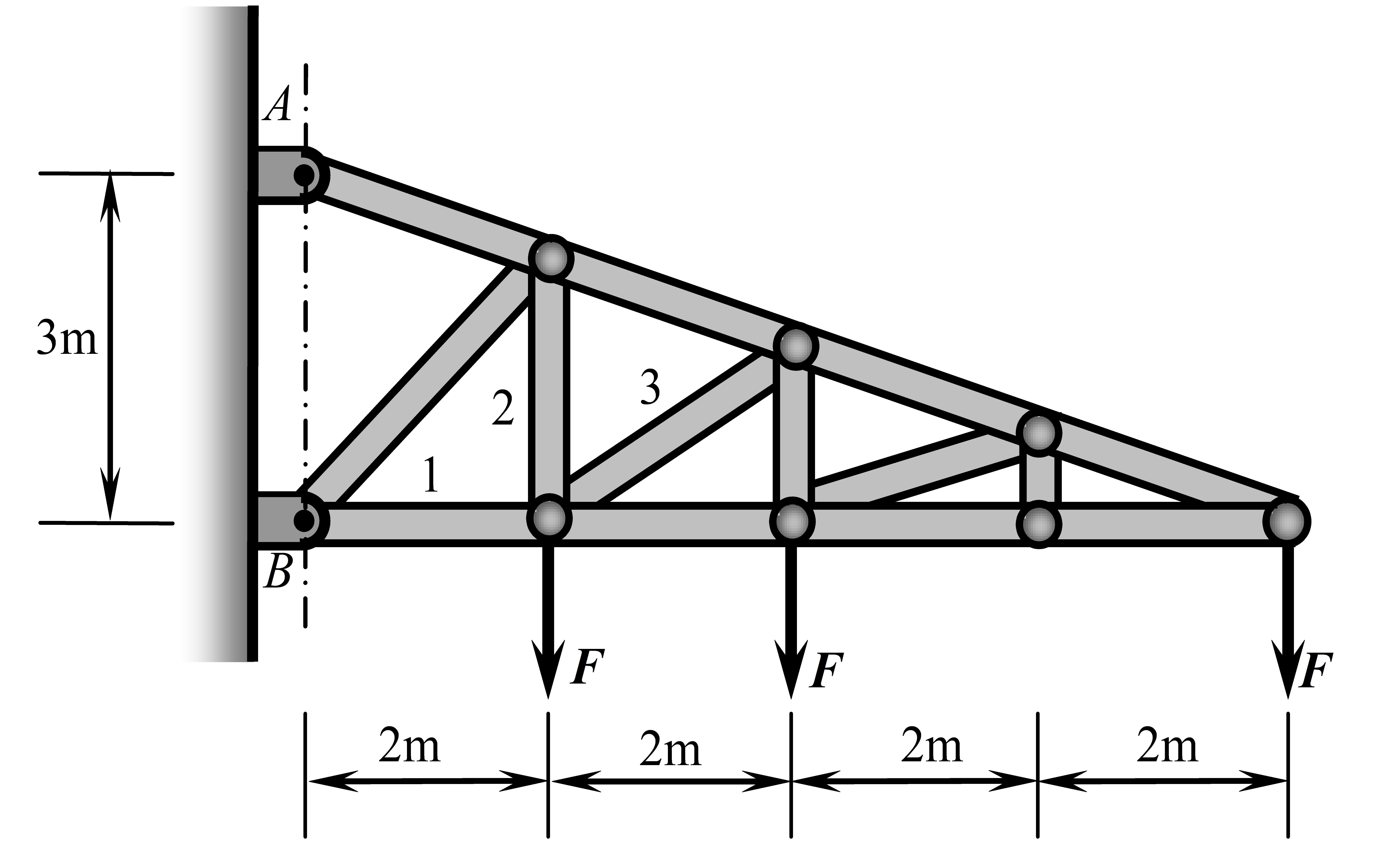 答案: 【 F1=-3.55F(受压),F2=1.67(受拉),F3=-1.11F(受压)