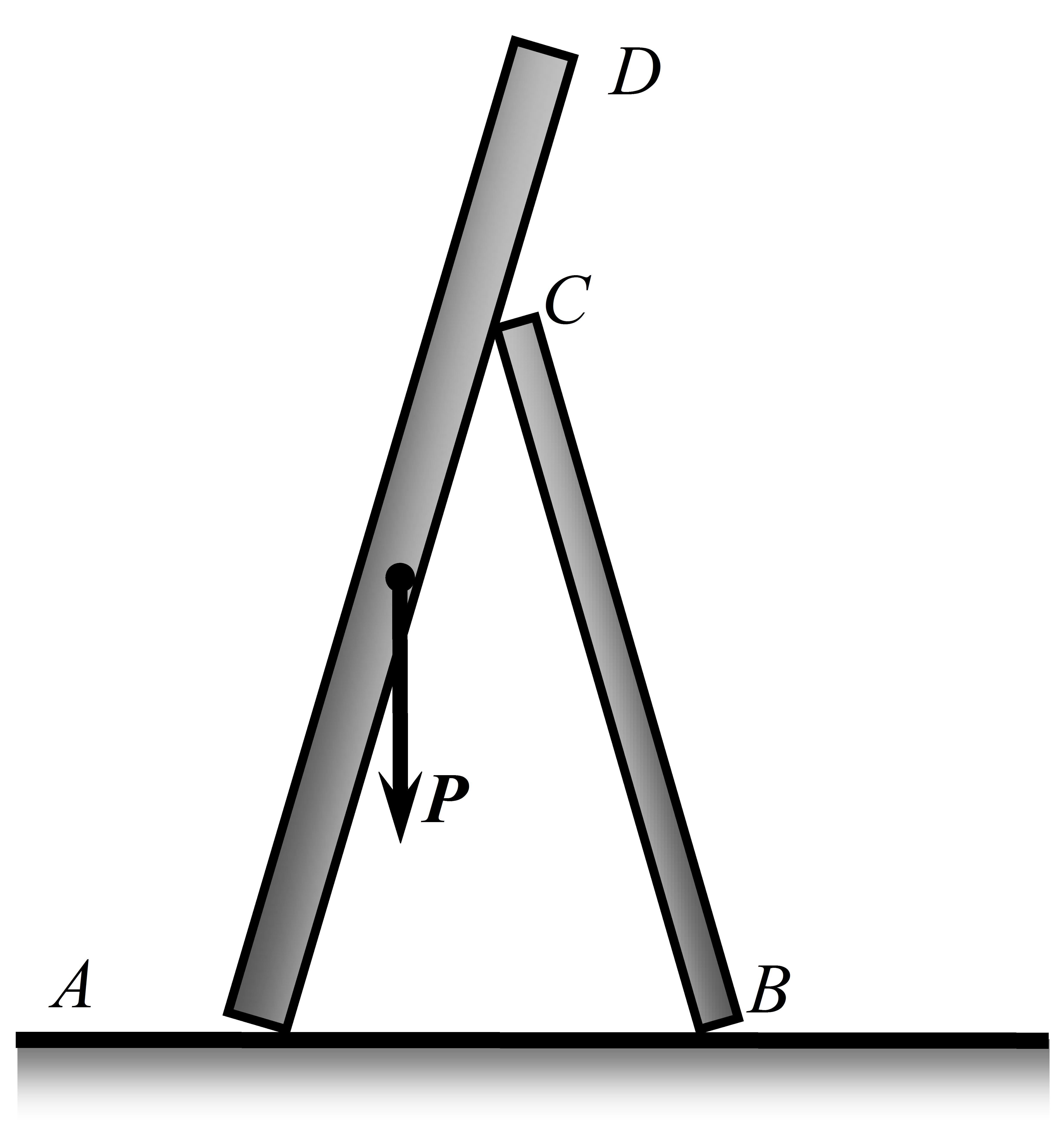 均质长板AD重为P,长4m,用一短板BC支撑,如图所示。若AC=BC=3mAB=1.55mBC板的自重不计。ABC处摩擦角各为多大才能使之平衡()。