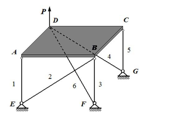 图示六杆支撑一水平板ABCD,在板角D处受向上铅直力P作用。求各杆的内力(并标出是拉力还是压力),设板和杆的自重不计,答案正确的是(