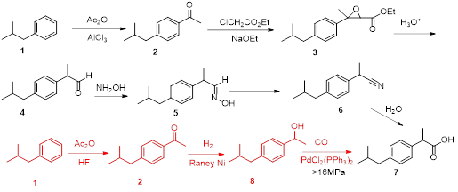 如图为美国Hoechst-Celanse 公司与Boots公司联合开发1条全新的布洛芬3步法工艺路线(1-2-8),即HCB路线。下列对其评价正确的有( )。