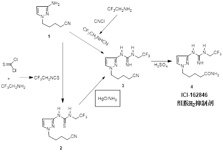 如图所示,化合物4为一种组胺H2抑制剂,用于治疗胃溃疡和功能紊乱。在如下图所示的胍基中间体3的合成过程中,用了HgO做了夺取S原子的试剂。下列说法正确的有( )。