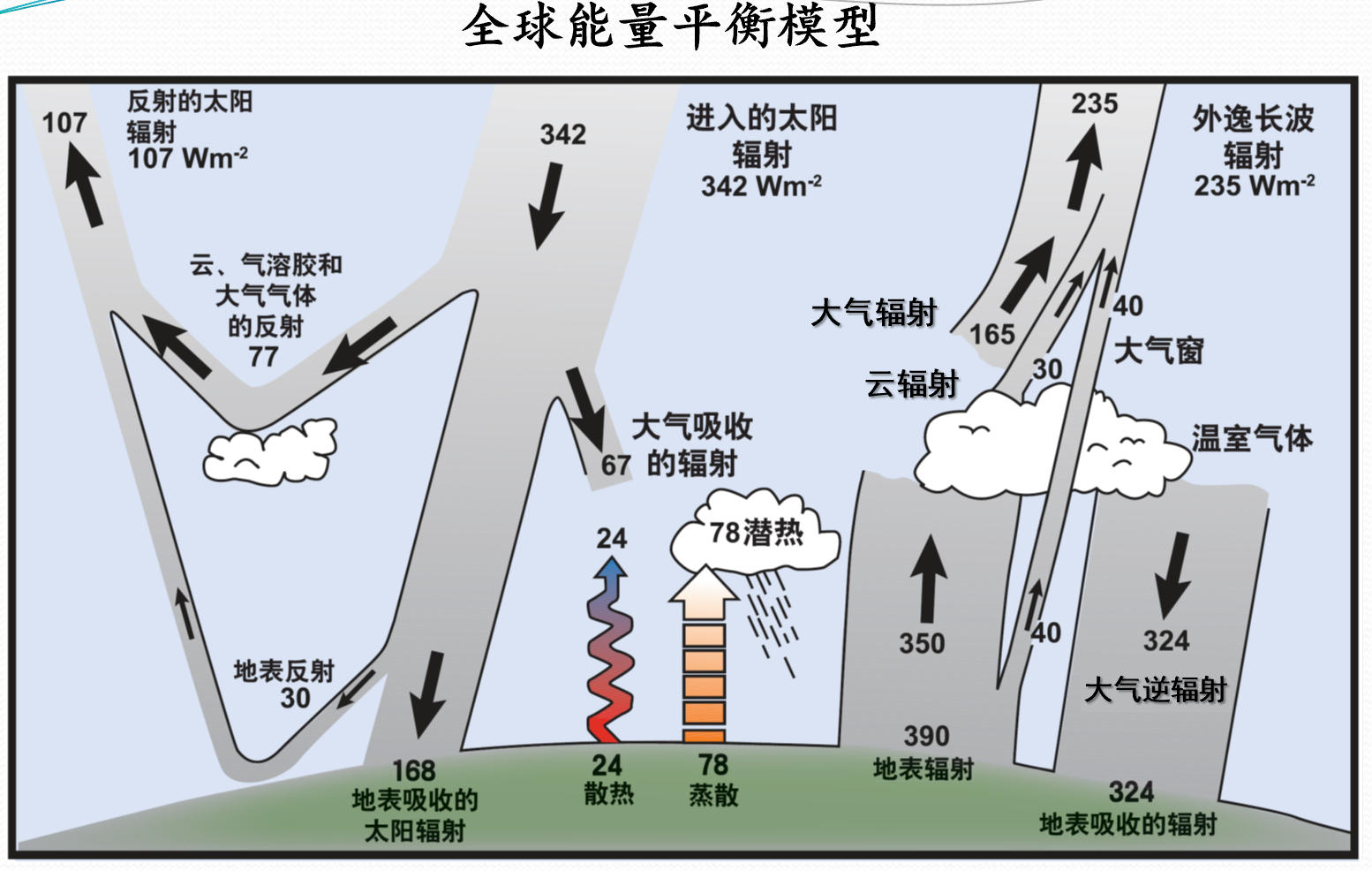 根据全球能量平衡模型图,分别计算地表总辐射和地面辐射差额的大小()