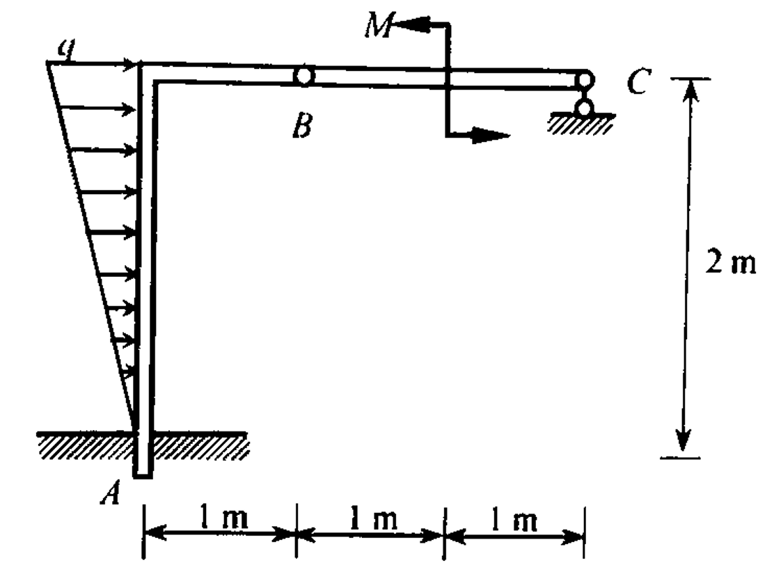 如图所示,系统由AB和BC两根杆组成,B处用销钉连接,其上受有线性分布荷载、集中力偶作用,q=6 kN/m,力偶矩M= 20kN•m, 尺寸如图,若不计各构件自重,求固定端A处的约束力。(力的方向以水平向左为正,竖直向上为正,矩的方向逆时针为正)