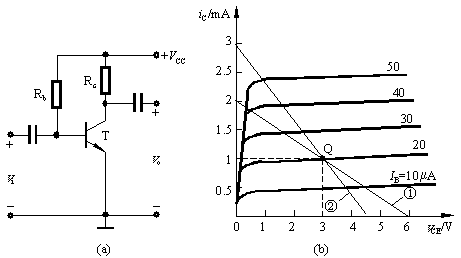 图 (b)示出了图 (a)固定偏流放大电路中三极管的输出特性,其中①为直流负载线,可求得电源电压VCC为()。