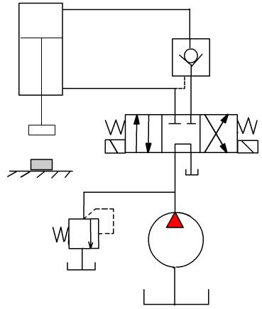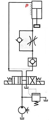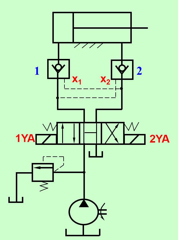 如下图:两个液控单向阀组成的双向液压锁的作用是实现将液压缸双向锁紧。