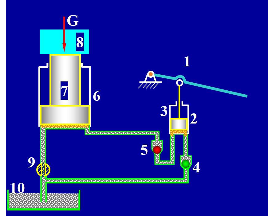 液压千斤顶中,小活塞缸3的作用是将液体的压力能转换为机械能对外做功。