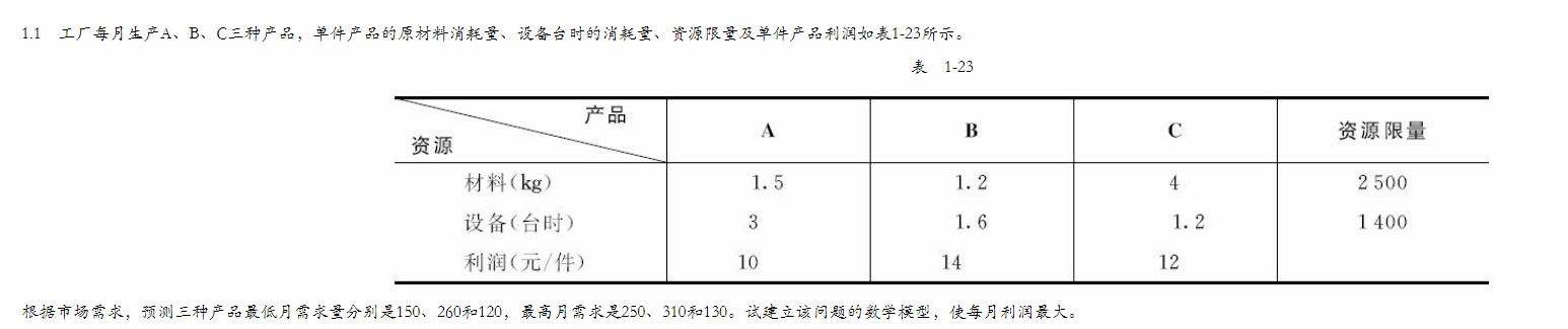 答案: 【 设x1、x2、x3分别为产品A、B、C的产量,则数学模型为maxz=10×1+14×2+12×31.5×1+1.2×2+4×3≤25003×1+1.6×2+1.2×3≤1400150≤x1≤250260≤x2≤310120≤x3≤130×1、x2、x3≥0】